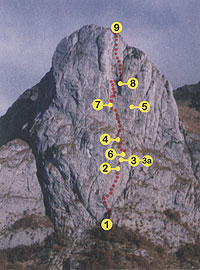 1. Attacco 2. Tiro del martello 3. Passaggio della bottiglia 4. Cengia 5. Fessura dei cuni 6. Fettuccia con chiodo 7. ...la meta era sempre pił vicina... 8. Tetto con passaggio di ottavo grado 9. Vetta |
